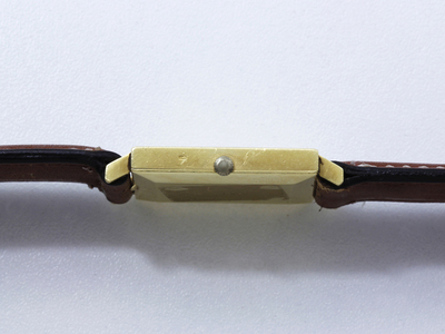 Montre bracelet d'homme en or 750 millièmes, cadran doré avec index bâtons appliqués. Cadran et lunette à décor ''clous de Paris