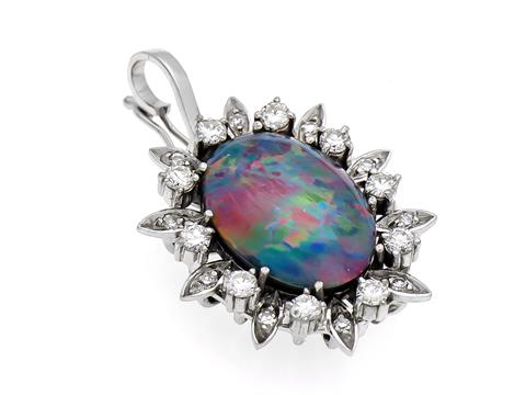 Opal brilliant clip pendant WG 750/000 with 10 diamonds, 0.50 ct W / SI and an oval opal stripe 15 x 10 mm with very good color play, L. 23 mm, 7.0 g