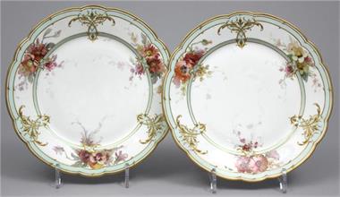 Gewellter Rand. Fahne umlaufend mit Goldemailmalerei, teils über türkisfarbenem Fond und mit drei unterschiedlichen Blumenbouquets in polychromer, qualitätvoller Weichmalerei (teils berieben). Szeptermarke mit rotem Reichsapfel über KPM, Berlin, 1871
