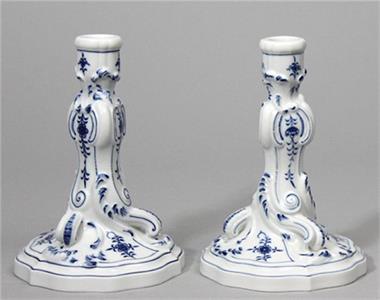 Leuchter je einflammig mit Tropfschalen in Rocaillenform. Blaues Zwiebelmuster. Schwertermarke Meissen, 20. Jh. 1. Wahl.
