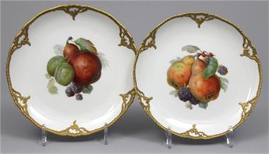 Reliefierter Rocaillenrand, goldbronziert. Im Spiegel bunt gemalter Obstzweig mit Birnen und Beeren. Szeptermarke mit rotem Reichsapfel über KPM sowie schwarzem Eisernen Kreuz, Berlin, 1914-1918. 1. Wahl. D. 22 cm.