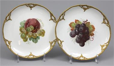 Reliefierter Rocaillenrand, goldbronziert. Im Spiegel bunt gemalter Obstzweig (1x qualitätvolle Hausmalerei) mit Trauben und Pfirsich. Min. best. Szeptermarke, einmal mit rotem Reichsapfel über KPM, Berlin sowie Jubiläumsmarke 1763-1913 bzw. 1871-194