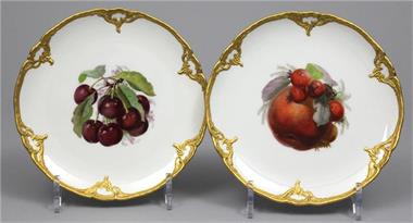 Reliefierter Rocaillenrand, goldbronziert. Im Spiegel bunt gemalter Obstzweig mit Kirschen und Apfel. Szeptermarke mit rotem Reichsapfel über KPM sowie einmal schwarzem Eisernen Kreuz, Berlin, 1914-1918 bzw. 1871-1945. 1. Wahl. D. 19 cm.