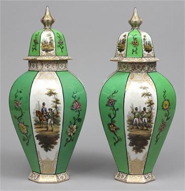 Achtpassige Balusterform mit verschieden, bunt gemalten Militärdarstellungen und blühenden Ranken auf grünem Fond, Goldmalerei in Rocaillenform (berieben). Boden mit blauer AR-Marke, Dresden, um 1900. H. 39 cm.