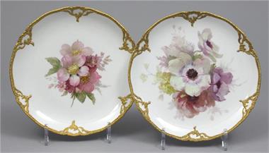Reliefierter Rocaillenrand, goldbronziert. Im Spiegel bunt gemaltes Blumenbouquet in Weichmalerei. Fahne äußerst min. best. Szeptermarke mit rotem Reichsapfel über KPM, Berlin, 1871-1945. 1. Wahl. D. 22 cm.