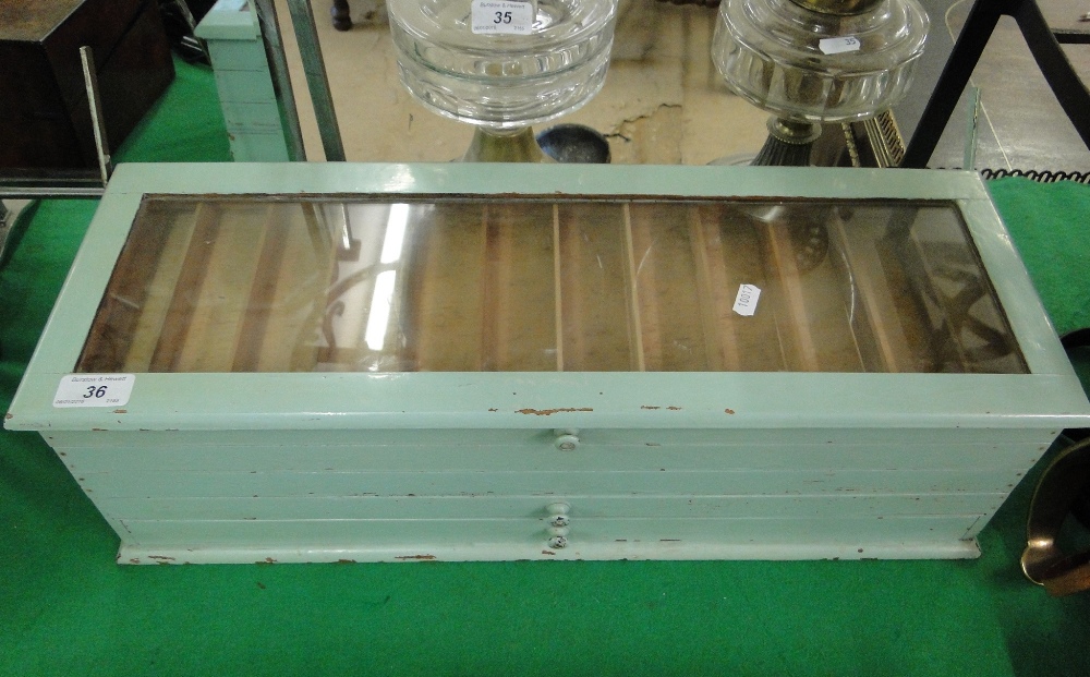 Painted pine table top Collector's cabinet with cantilever movement and drawer under.