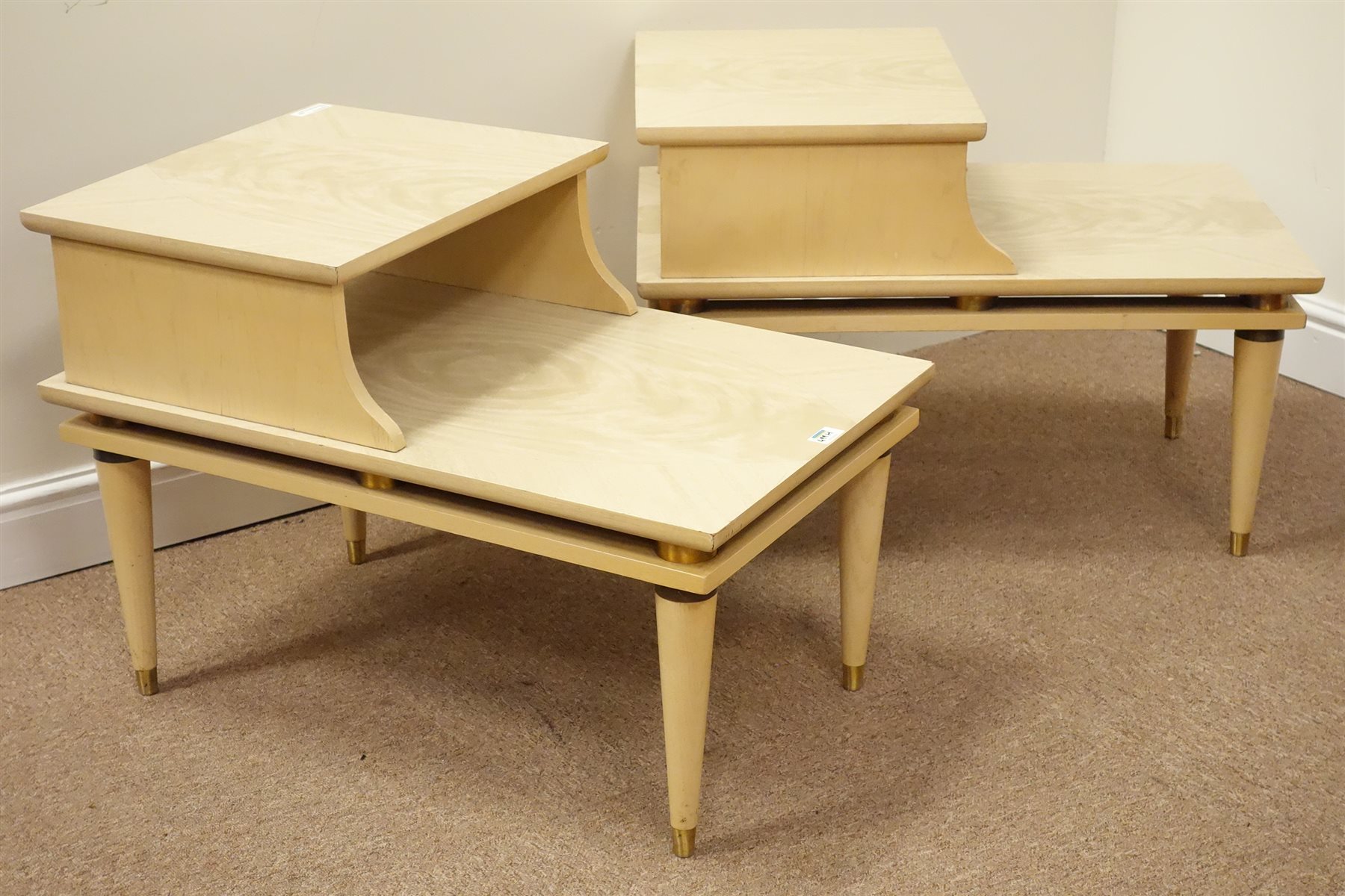 Pair 1950s bedside/sofa tables, bleached mahogany finish, raised on tapering legs