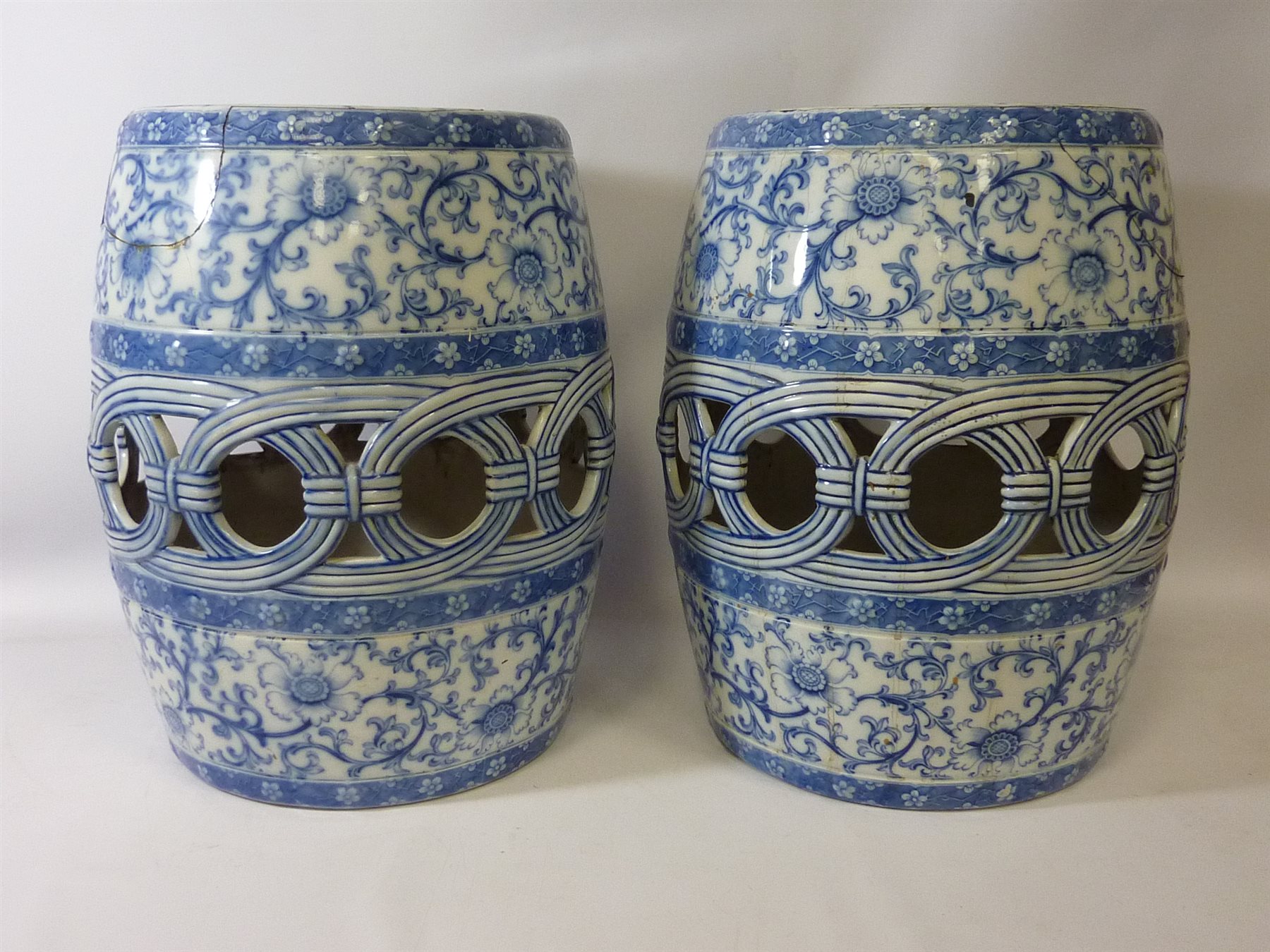 Pair 19th century Minton blue and white garden seats, date code for 1867