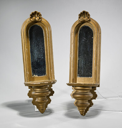 Pair of antique Continental carved gilt wood wall mirrors; each of slim arch-form; exhibiting shell-motif finial; all atop a semi-circular tiered base; Provenance: Estate of Joey Bishop; H: 20" (each, approx.)