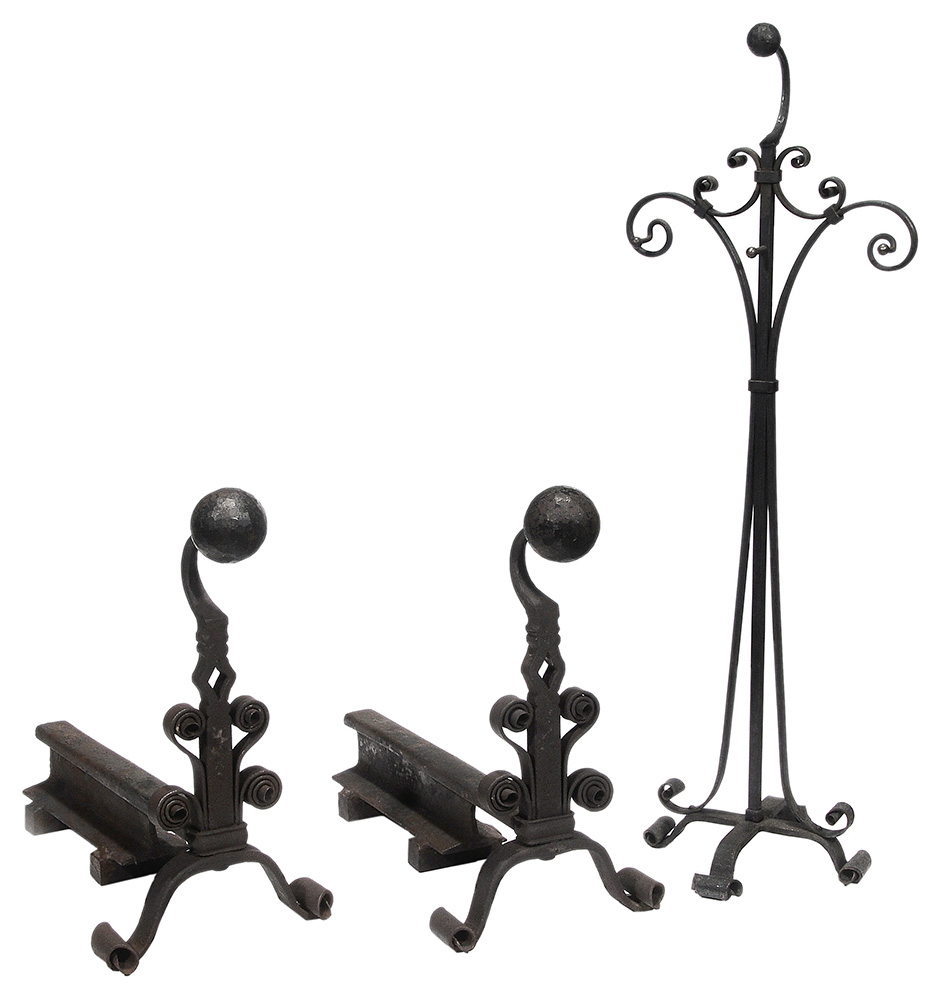 Pair Arts and Crafts Wrought Iron Andirons and Fireplace Tool Stand, Early 20th century