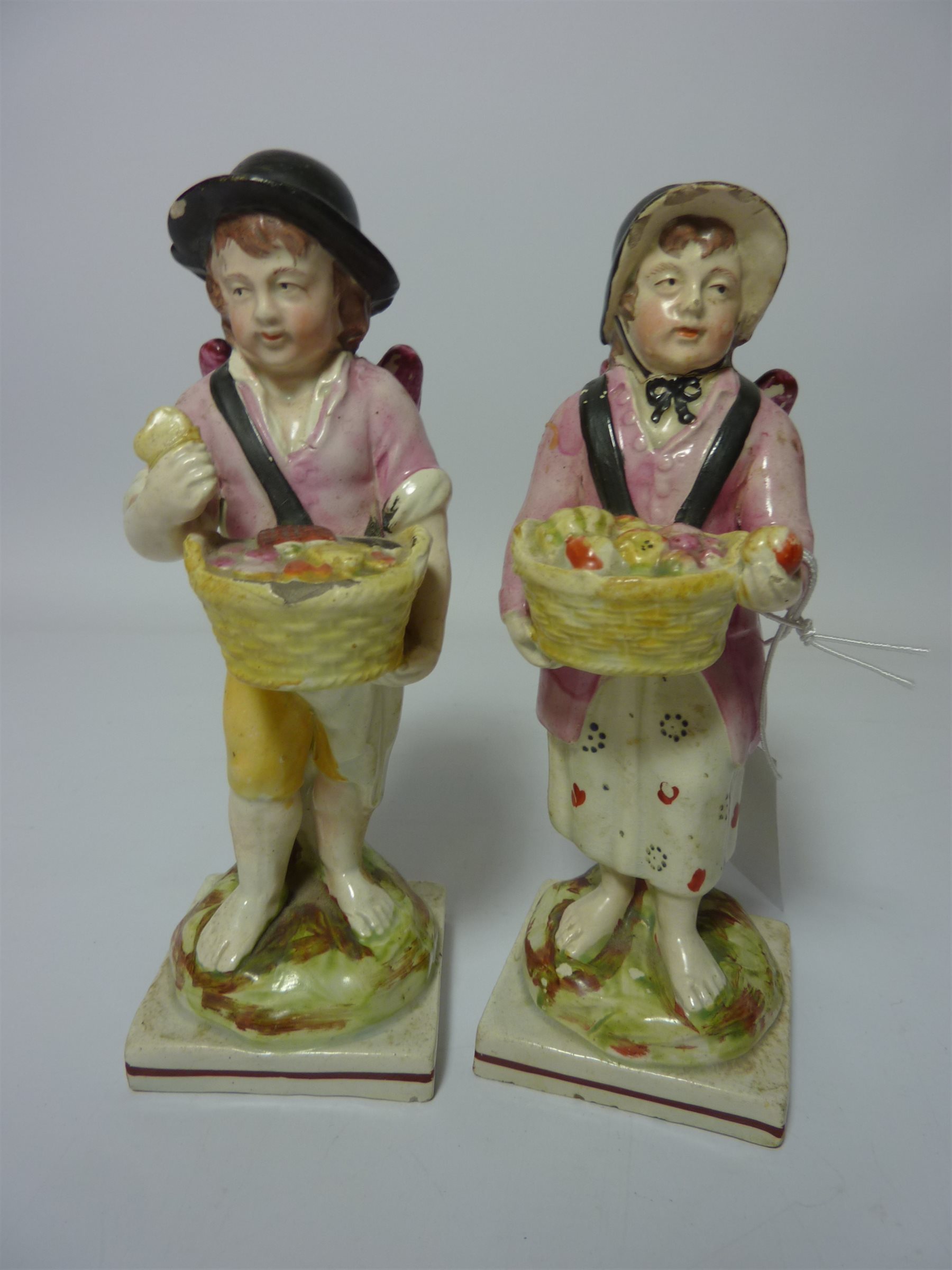 Pair early 19th century Staffordshire cherubic figures with baskets of fruit