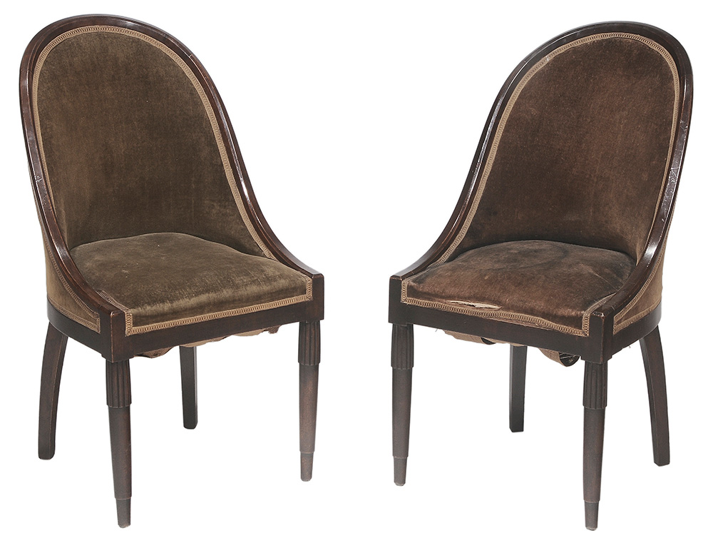 Pair French Art Deco Carved Mahogany Upholstered Chairs, c 1930