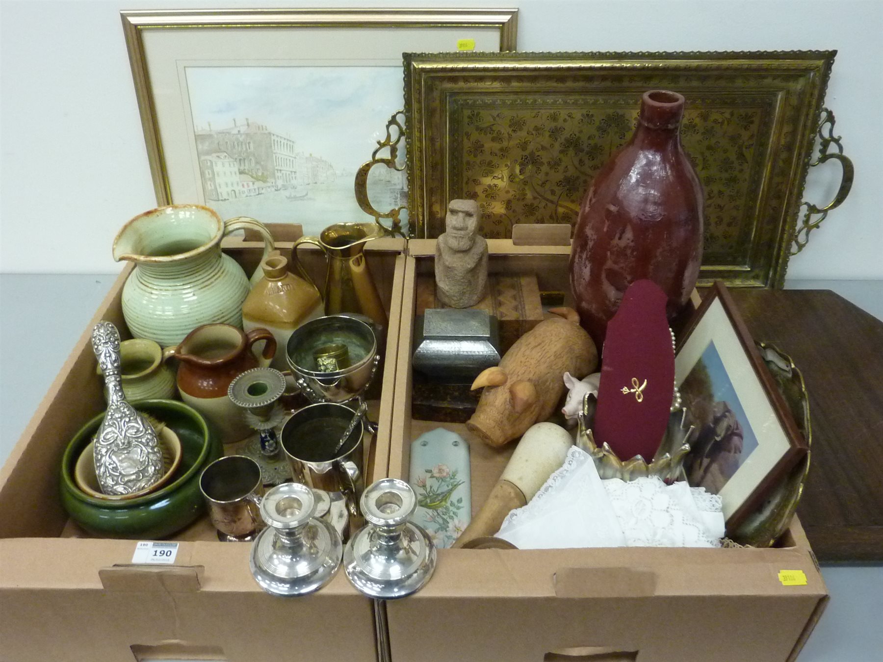 Pair hallmarked silver candlesticks H8cm, hallmarked silver backed hairbrush, eastern silver-plated tea caddy, ornate brass tray, watercolour of Venice, and miscellanea in two boxes