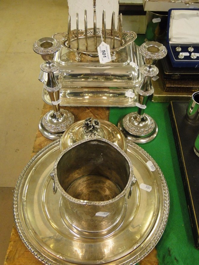 Pair of candlesticks, plated trays, 2 tureens, toast rack, etc.