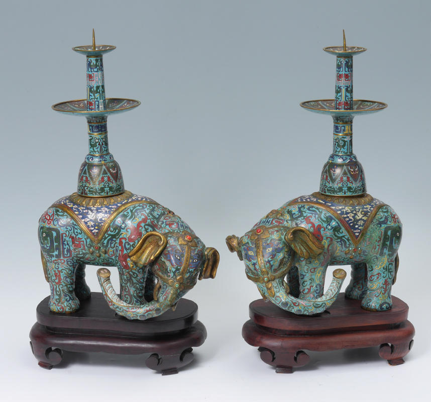 PAIR OF CHINESE CLOISONNE ELEPHANT CANDLE STANDS