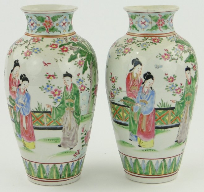 Pair of Chinese Famille Vert baluster vases, 10.25''.