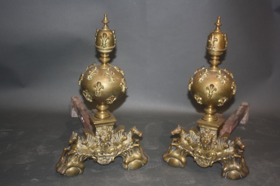 Pair of gilt bronze andirons, fleur-de-lysée ball on marine horses and lion head.