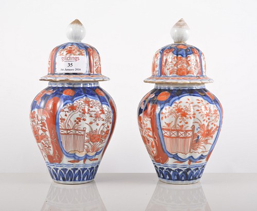 Pair of Imari fluted baluster vases with domed covers