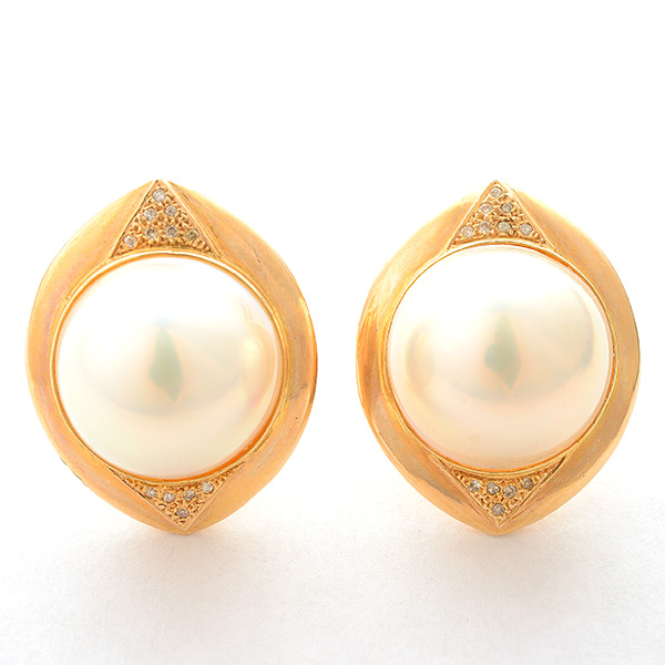 Pair of Mabe Cultured Pearl, Diamond, 14k Yellow Gold Earrings.