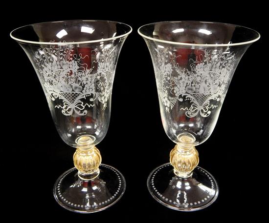 deep bell-form bowls with flared rims, etched floral fruit and garland motifs, textured spherical standards with gold flecking, circular bases with etched circular decoration along perimeter, signed indistinctly on base along with "Murano," expected