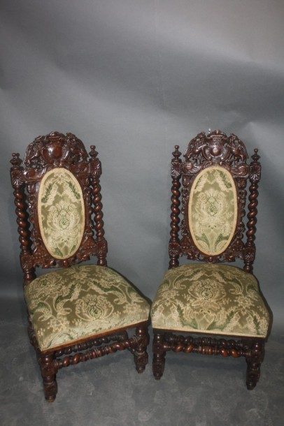 Pair of oak chairs carved with coat of arms supported by two griffins, foliage and flowers.
