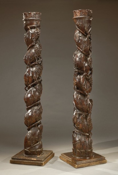 Pair of patinated resinous columns carved with vine shoots, bunches of grapes and foliage.