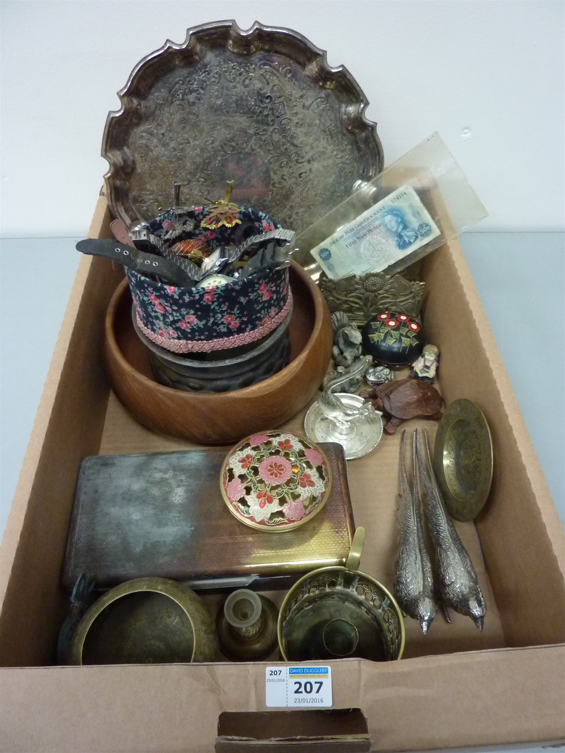 Pair of silver-plated peacock ornaments, costume jewellery, banknote, treen and metalware in one box