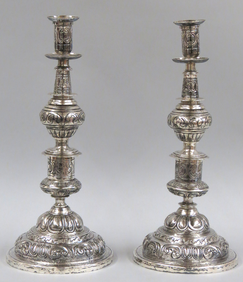 PAIR OF SPANISH COLONIAL-STYLE SILVER CANDLESTICKS