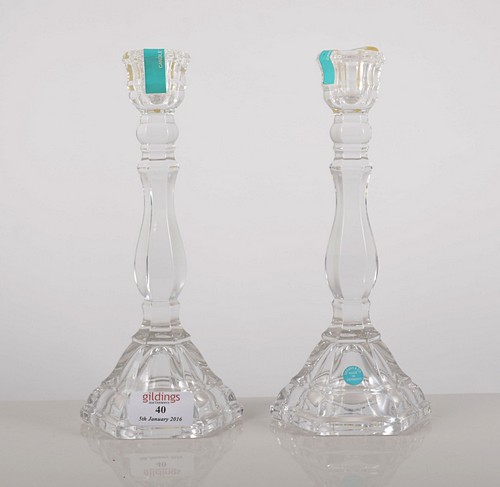 Pair of Tiffany crystal candlesticks, hexagonal shape, 54cm, boxed