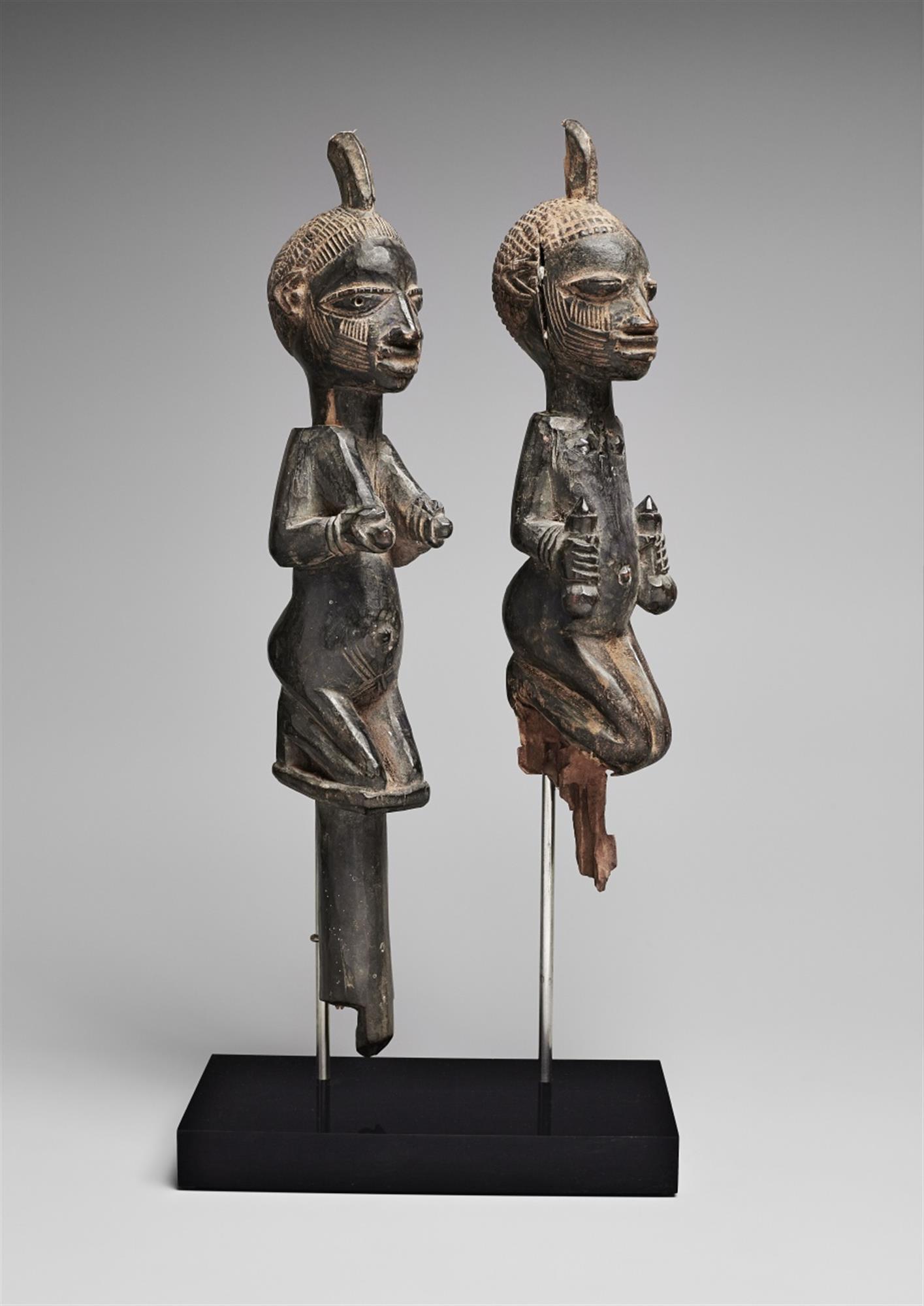 Ogo elegba, male and female, the kneeling male and female figures with scarified cheeks and small projection to the top of the head, the female holding her breasts, the male holding a vessel in each hand, black patinas.