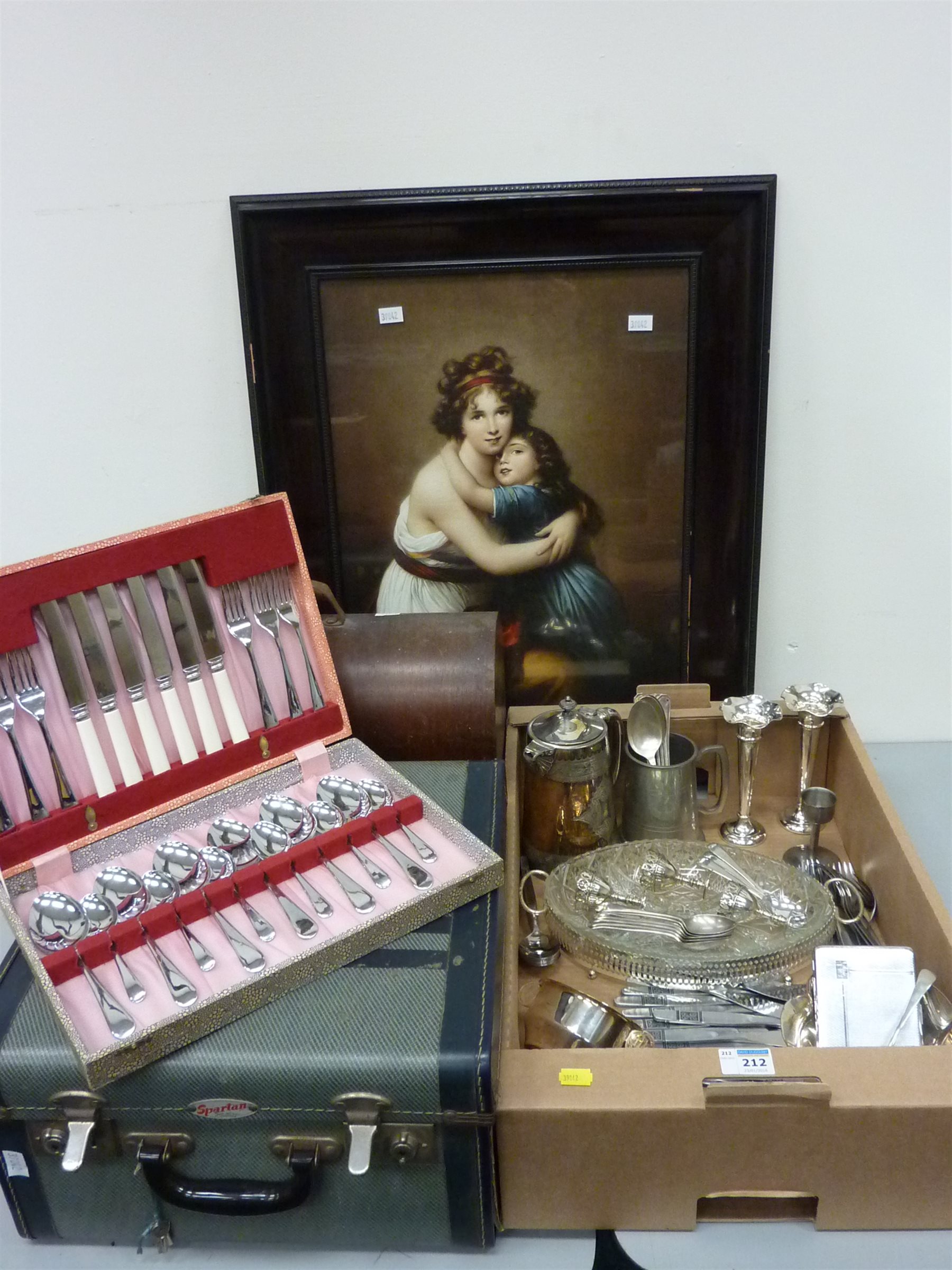 Pair silver-plated trumpet shape vases, other silver plate, records in one case, Singer sewing machine and an Edwardian colour p