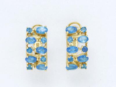 Paire de boucles d'oreilles en vermeil 800 millièmes, à décor ajouré, légèrement galbées, rehaussées d'apatites rondes et ovales facettées en serti griffe. (petits manques de matières) Poids brut: 5.60 g. Dim: 2 x 0.9 cm.