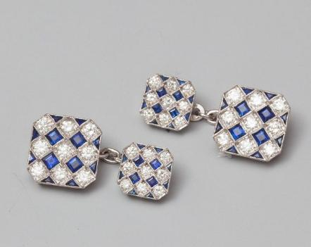 Paire de boutons de manchettes en or gris, 750 MM, ornés de saphirs et diamants, total des diamants
