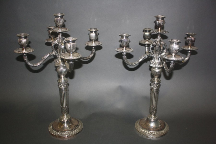 Paire de candélabres en métal argenté orné de godrons, feuillages, palmettes et feuilles d'eau, à bouquet de cinq bras de lumière dont un central, fût cannelé sur base cylindrique.