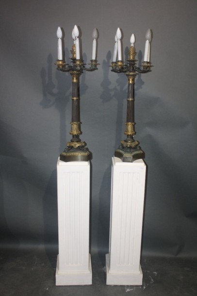 Paire de grands candélabres en bronze patiné à l'antique et doré, ornés de palmettes, supportant un bouquet à cinq bras de lumière plus une centrale, pied tripode à pattes de lion sur socle triangulaire.