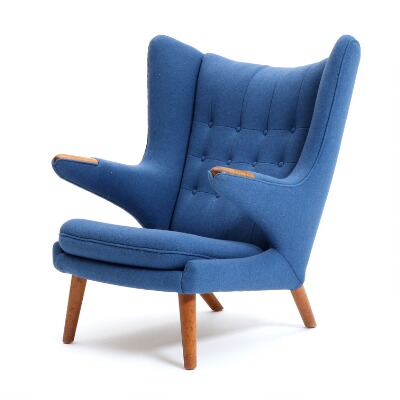 Easy chair with oak legs and nails, recently upholstered with blue wool
