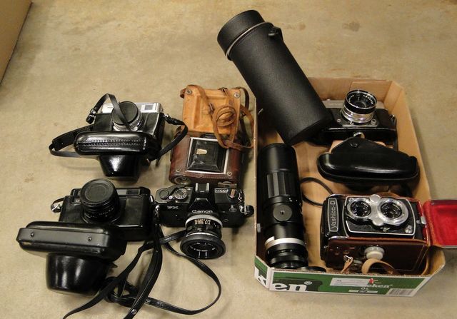 Parti äldre kameror bl.a. Canon FX med objektiv 1:1.8