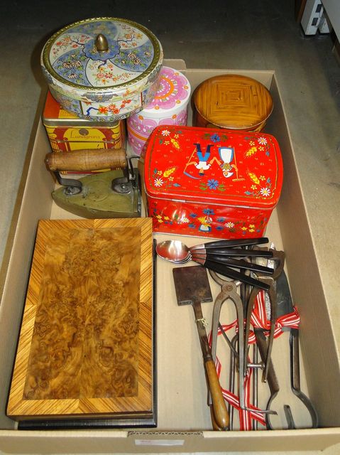 Parti äldre plåtburkar, träskrin med monogram, äldre strykjärn, hårkrusare, fårsax