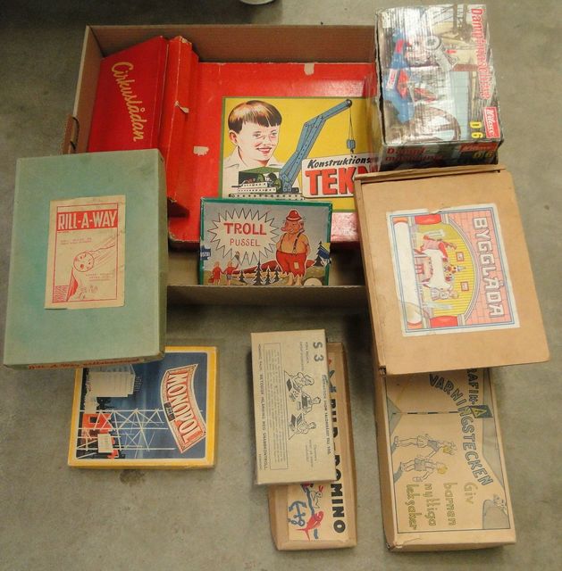Parti äldre spel och pussel samt Wilesco ångmaskin, Konstruktionslådan teknik No. 6, alla delar med mindre ytslitage