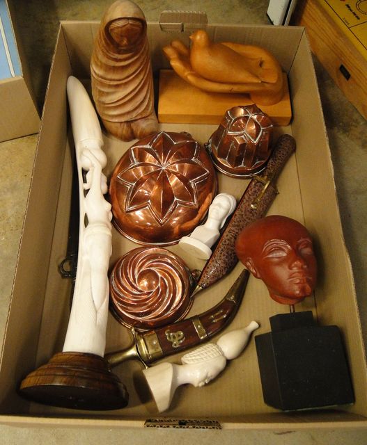 Parti bl.a. aladobformar koppar, prydnadsknivar, skulpturer i benliknande material, L11-52cm, träfigurin