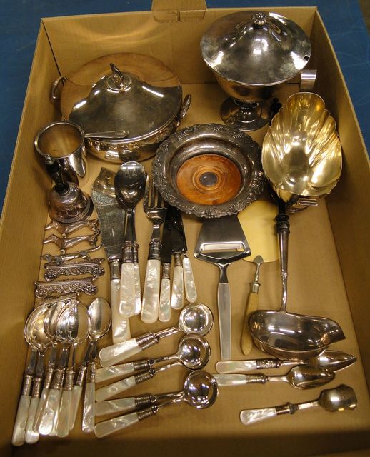 Parti bl.a. nysilver, bestick med pärlemorskaft