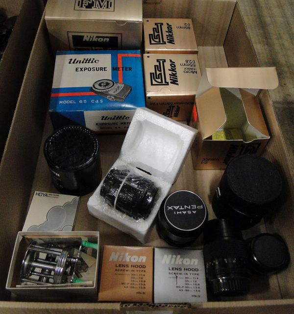 objektiv Nikkor 3st 35, 55, 85 m.m, Canon objektiv samt fiskrulle Record i originallåda
