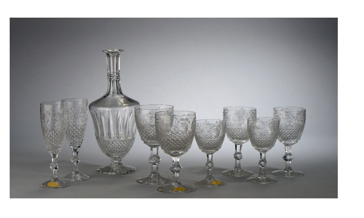 Part of crystal stemware service with braid cut diamond spikes topped with scrolls feuillagées. It includes twelve water glass (accident), twelve red wine glasses, white wine glasses twelve and twelve champagne flutes. We attached a SAINT-LOUIS caraf