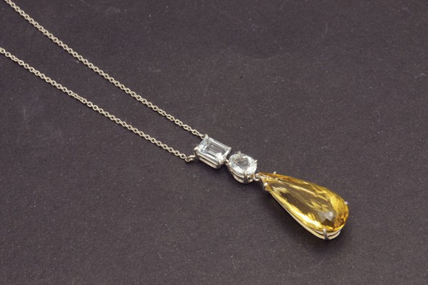 White gold pendant 18 K with knob yellow beryl (10.13 cts.) Adorned with oval and emerald cut aquamarine aquamarine (1.67 cts.).