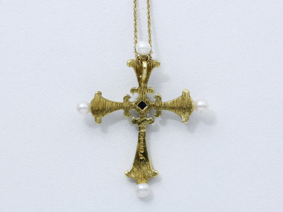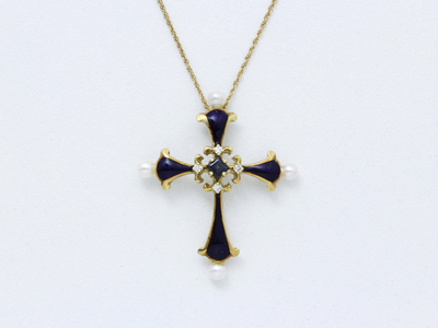 Pendentif en or 750 millièmes stylisant une croix émaillée, ponctuée de petits diamants brillantés, de 4 perles de culture et d'une pierre bleue. Il est retenu par une fine chaîne en or 750 millièmes, maille corde, avec fermoir anneau ressort. Poids