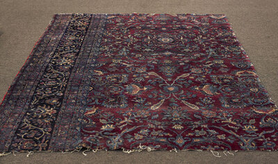 Persian Kerman wool rug section; showing scrolling flora on a burgundy ground; 100" x 69" (approx.)