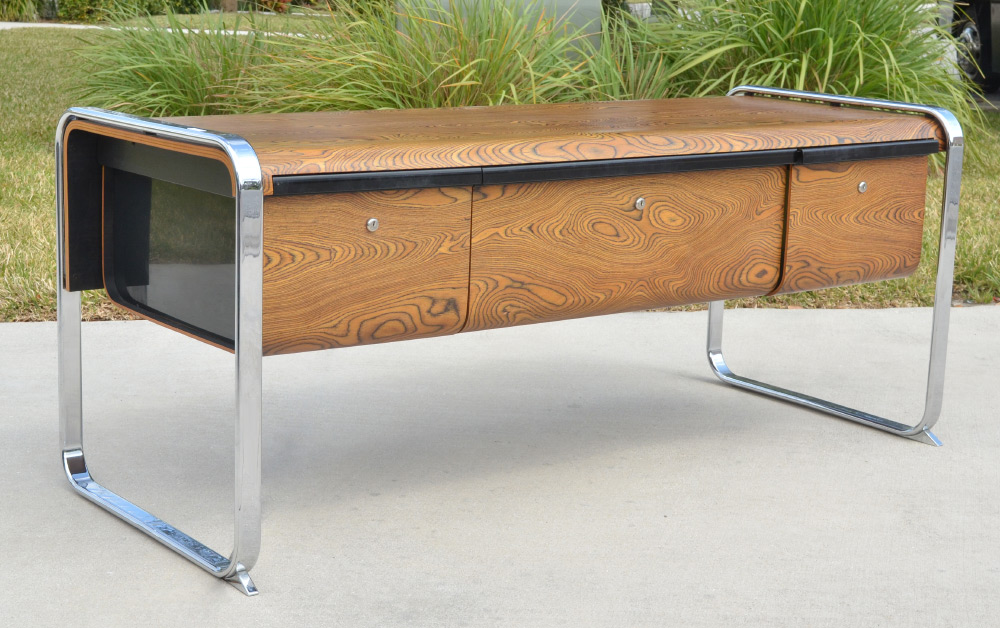 bent African zebrawood and chromed steel construction with lucite side panels to the 3 drawers