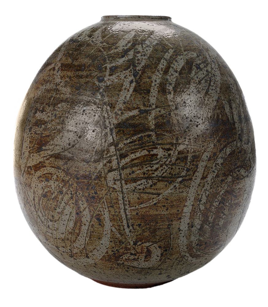 stoneware wheel-thrown vase of bold globular form with contrasting abstract spirals