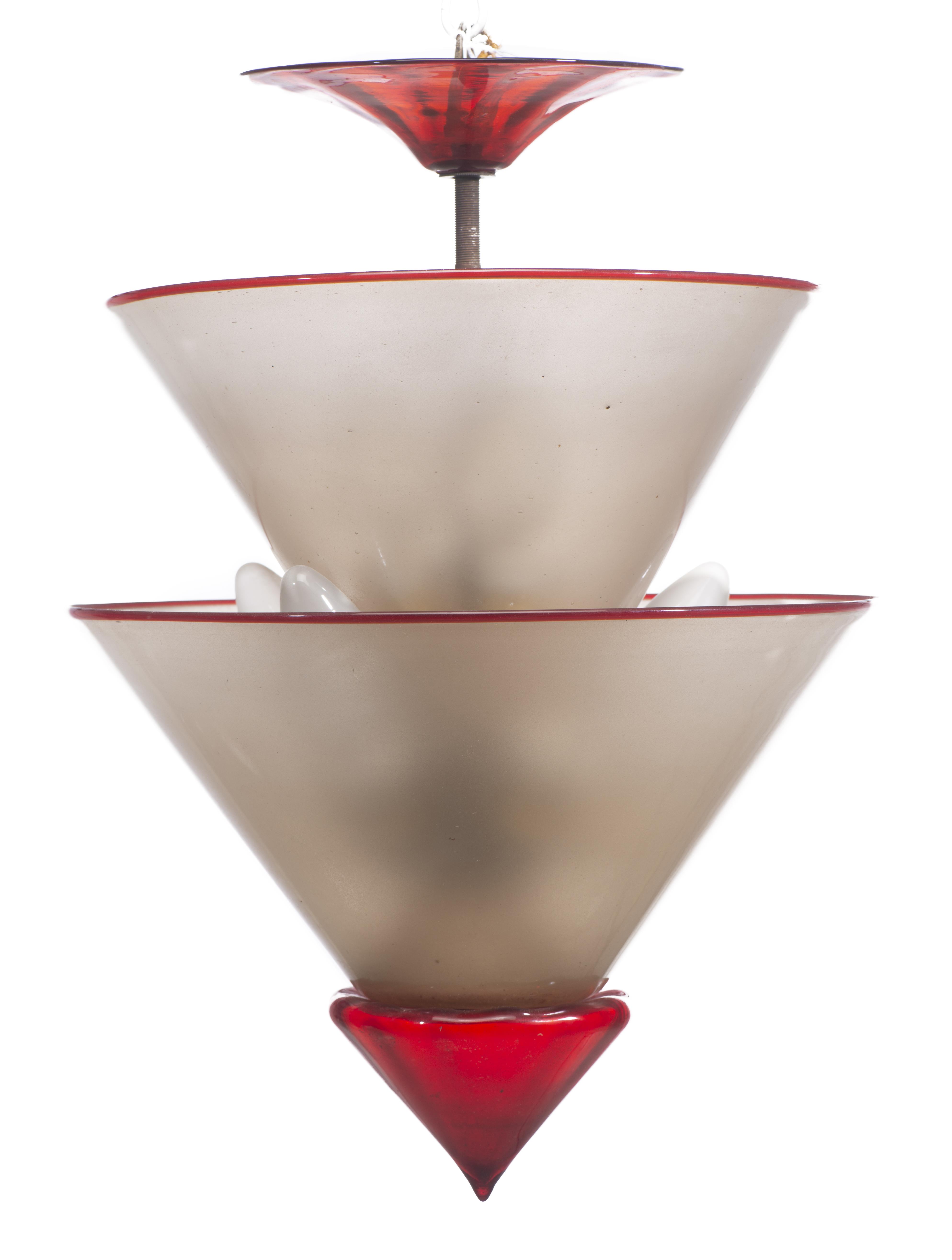 Plafonnier moderniste à 9 feux en verre bicolore rouge et blanc à 2 vasques coniques, Murano Bauhaus circa 1930.