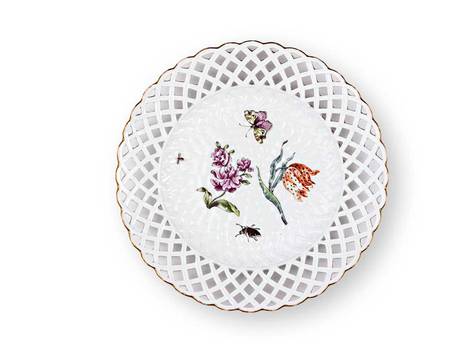 Wood cut flowers with insect, butterfly and beetle. Gold rim. Blue swords Meissen, 1740. Ø 23 cm